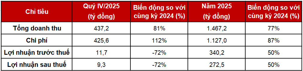 Mặc dù chi phí năm 2025 tăng lên 1.127 tỷ đồng, cả năm 2025, DNSE vẫn về vượt kế hoạch mục tiêu với lợi nhuận trước thuế 340,2 tỷ đồng, lợi nhuận sau thuế 272,5 tỷ đồng, tăng 50% so với 2024.